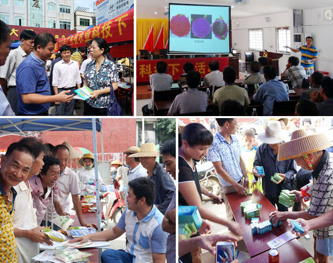 上午在乌石镇政府所在地开展送农业科技计生服务下乡活动。通过农业主导品种和主推技术宣传图片展示、现场技术咨询、免费派发农资商品、农科丛书、计生用品和资料,以及专题技术讲座等多种形式向当地农民送品种、送服务、送科学、送技术,宣传农业、计生的最新政策,宣传科学种田知识。华南农业大学秦永华副教授现场讲授了火龙果栽培技术,中国热科院南亚所欧雄常助理研究员讲授了青枣栽培技术。