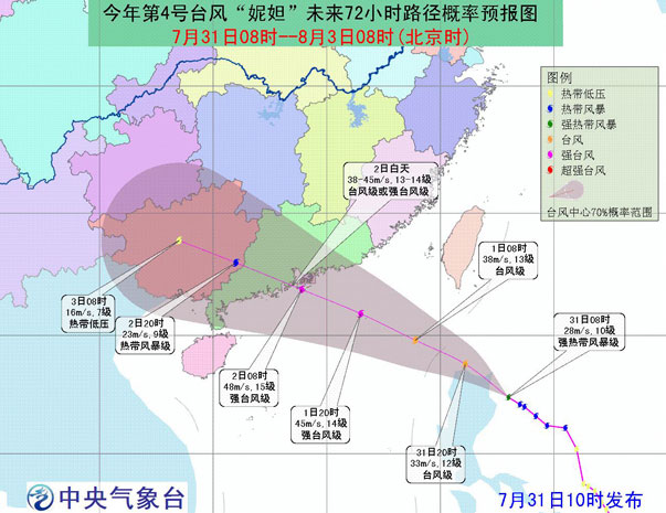 据省气象局预测,今年第4号台风“妮妲”将于8月2日早晨到中午以台风或强台风级登陆广东省沿海地区,正面袭击珠江三角洲地区,将是今年登陆广东省的第一个台风。受其影响,8月1日夜间-3日,珠江三角洲地区及清远市有暴雨到大暴雨局部特大暴雨,粤东、粤西地区有暴雨局部大暴雨,其他地区有大雨到暴雨;广东省沿海地区将有10-12级大风,阵风14级。省防总、省重大气象灾害应急办公室于8月1日上午8:00分别启动防风Ⅱ级应急响应、气象灾害(台风)Ⅱ级应急响应。省农业厅认真贯彻省委书记胡春华、省长朱小丹重要批示指示精神,按照副省长、省防总总指挥邓海光在省防总工作会议上的部署要求,紧急部署“妮妲”有关防御工作。厅主要领导指示要求各地尤其是珠三角地区农牧部门和厅各处室单位,迅速动员起来,提前做好预警预防,全力做好台风防御和灾后生产恢复工作,确保农业生产和人民生命财产安全。