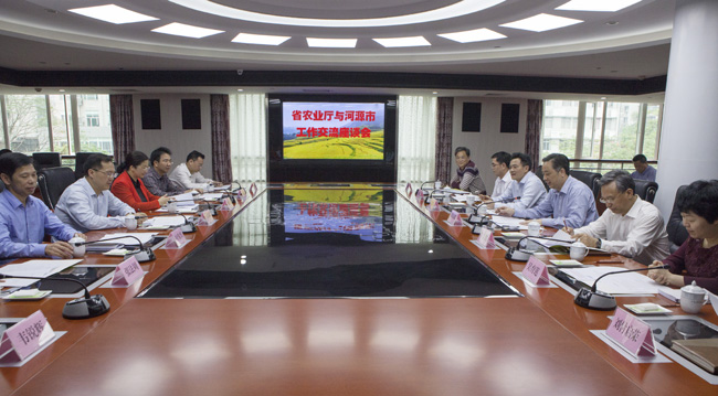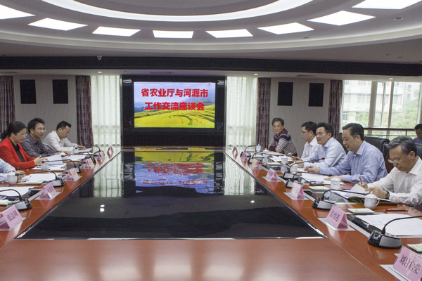 4月7日下午,广东省农业厅郑伟仪厅长会见了到访的河源市委常委、统战部部长叶春球和副市长朱蔚蔚一行,听取了河源市2016年农业农村经济发展情况及2017年重点工作介绍。双方就"三园一体"、农业公园、设施农业、农产品加工业转型升级、灯塔盆地和农业执法体系建设等议题进行了深入交流。厅领导牛宝俊、郑惠典、吴育莲、蔡树淦同志以及有关处室单位主要负责人参加了座谈。