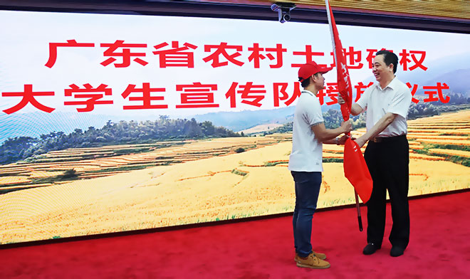 7月3日,广东省农业厅举行农村土地确权大学生宣传队授旗仪式,厅党组书记、厅长、省确权办主任郑伟仪为5所高校农村土地确权大学生宣传队代表授旗。华南农业大学、广东海洋大学、仲恺农业工程学院、佛山科学技术学院、广东科贸职业学院以及省农业厅团委的40名代表,省确权办全体人员参加授旗仪式。省农业厅班子成员出席授旗仪式。