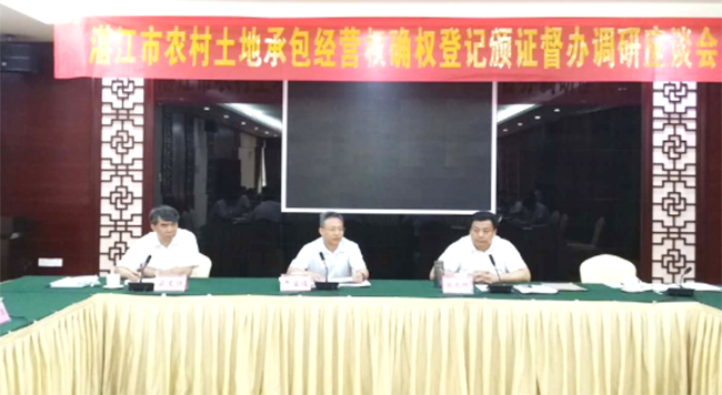 7月26日下午,广东省农业厅牛宝俊副厅长率队前往湛江市遂溪县遂城镇牛圩村调研土地确权进展情况。7月27日上午组织召开了湛江市分管领导、所辖县(区)政府分管领导及农业局局长约谈会,听取了市、县两级主抓确权工作的主要做法,土地确权工作进展及下一步工作打算。