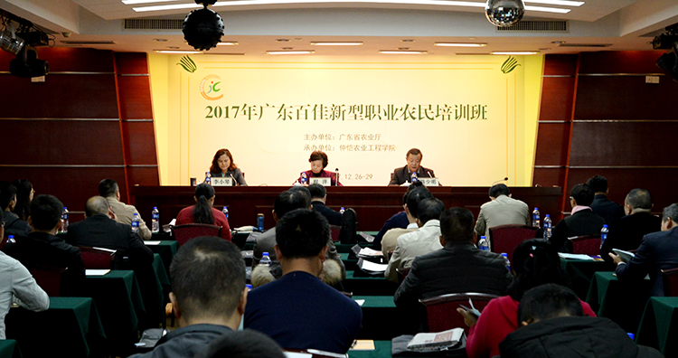 12月26日上午,广东百佳新型职业农民培训班开班仪式在广州举行。广东省农业厅巡视员程萍、仲恺农业工程学院校长骆少明、仲恺农业工程学院副校长李小琴等出席开班仪式并为全国新型职业农民培育示范基地揭牌。