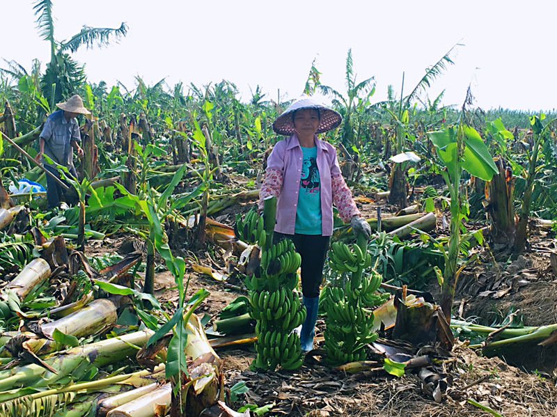 台山市海晏镇的蕉农处理台风吹折的香蕉树